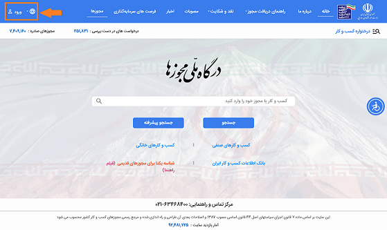 - به درگاه ملی مجوزها به نشانی “mojavez.ir” مراجعه و از بالای صفحه بر روی عبارت “ورود” کلیک کنید.