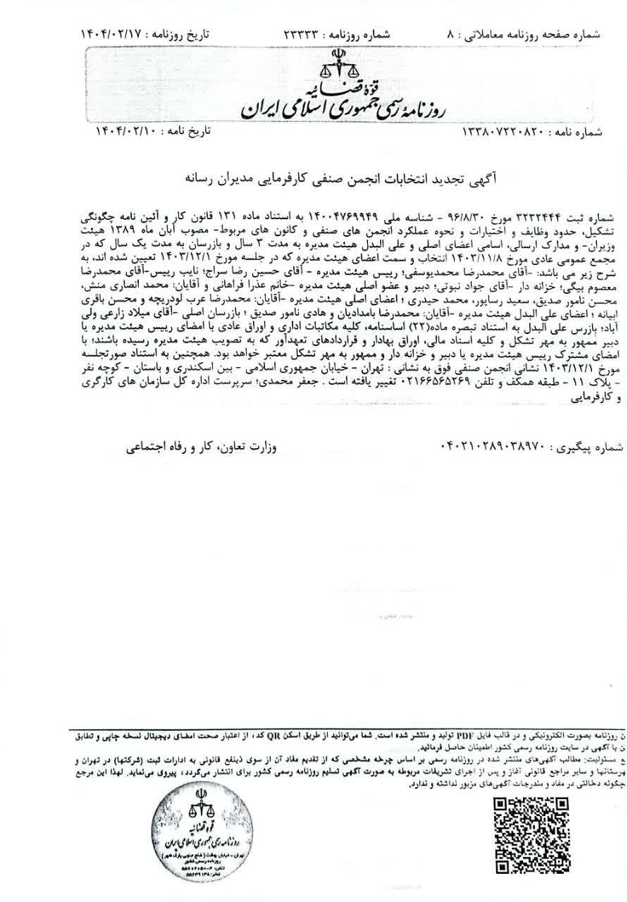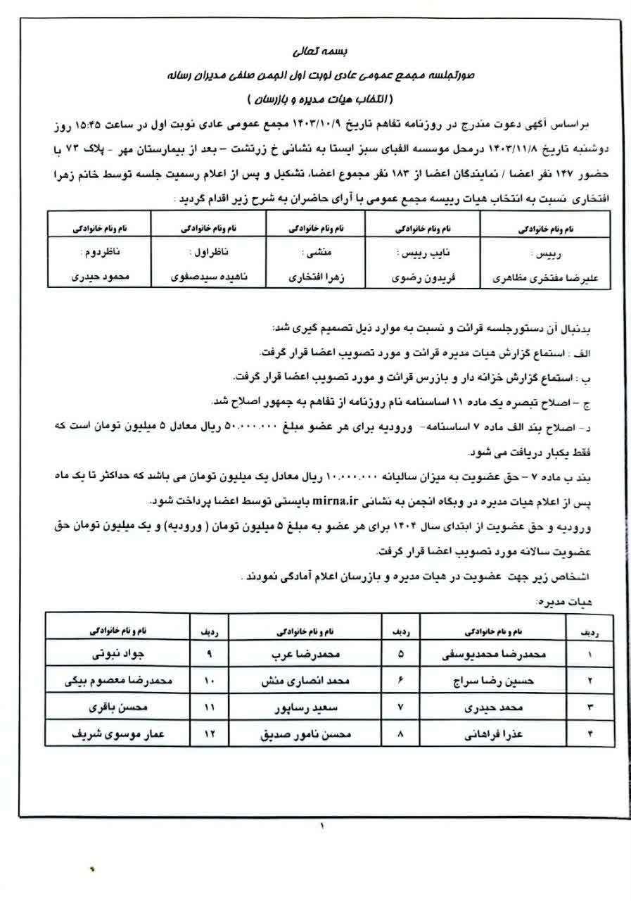 گفتنی است در مجمع عمومی هشتم بهمن ماه 1403 بخشی از مفاد اساسنامه از جمله مبلغ ورودیه، حق عضویت سالانه و تغییر روزنامه رسمی به روزنامه جمهور و اصلاح ماده 9 صورت گرفت.